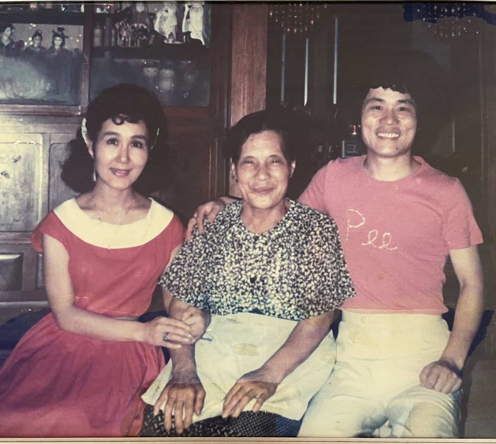 数十年前の母親とのスリーショットが事務所の壁に。
